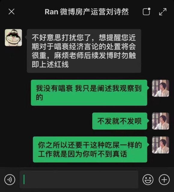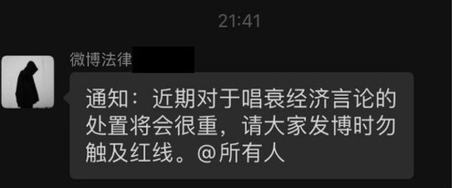 「微博法律」還在一個群組發布通知:「近期對於唱衰經濟的處置將會很重,請大家發博