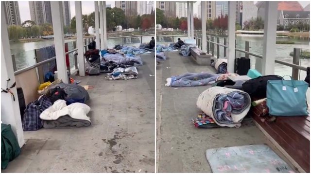 中國經濟衰退,底層民不聊生。圖爲2023年12月12日,江蘇昆山市露宿公園的打工人。(