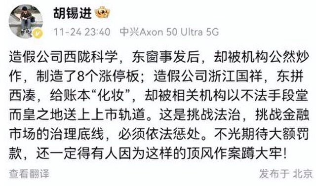 11月24日深夜,胡錫進在微博上罕見破防大罵浙江國祥、西隴科學等公然造假操縱股市。
