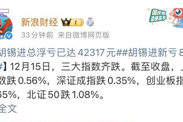A股三大股指全跌 胡錫進巨虧超4萬