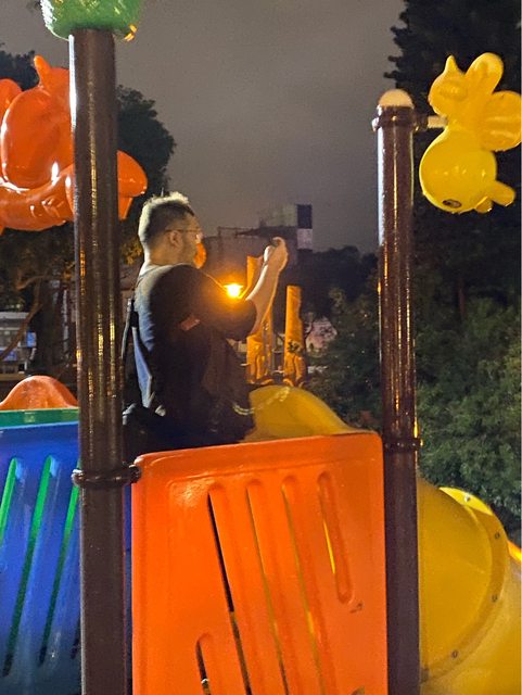 四叉貓還要站在很遠的溜滑梯拍照