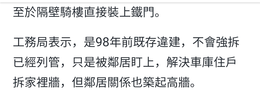 → TheoEpstein: 因為法律上那個鐵門是「既存違建」, 49.216.81.173 12/19 09:11