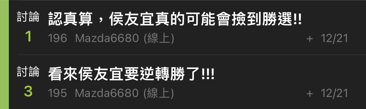 → arceus: 賴民調沒輸過 投侯 賴照樣贏 不信你試試 1.200.51.39 12/21 11:57