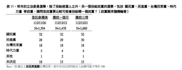 有趣是政黨票最近三次調查,民進黨從28->29到現在30,藍白兩黨則三次調查都是32、18