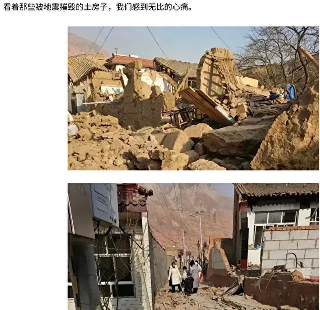 文中稱,甘肅地震震驚了全國,「看著那些被地震摧毀的土房子,我們感到無比的心痛。