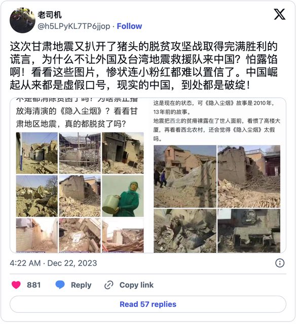 網民「老司機」發文說,「這次甘肅地震又扒開了豬頭的脫貧攻堅戰,取得完滿勝利的謊