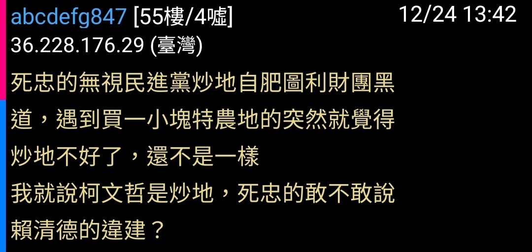 → abcdefg847: 我就說柯文哲是炒地,死忠的敢不敢說 36.228.176.29 12/24 13:43
