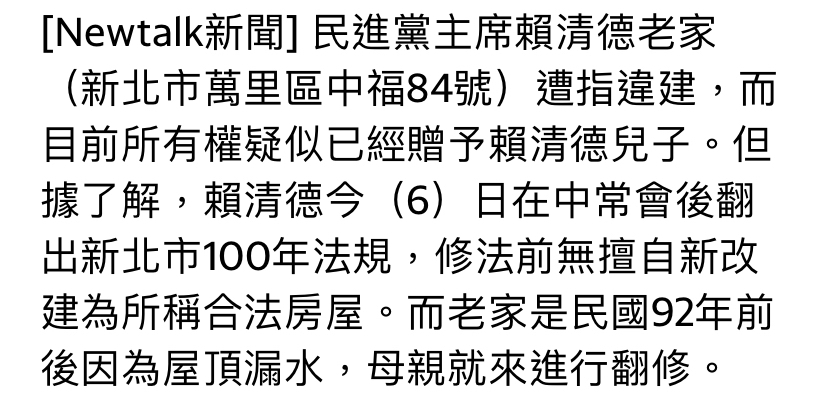 → chx64: 賴老家有在都市計畫範圍? 用違章建築管理辦 175.182.162.28 12/24 19:55