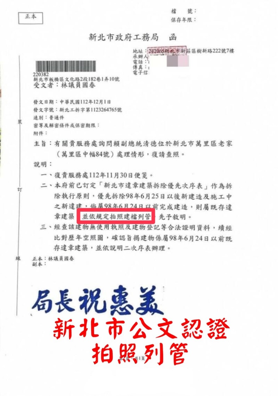 → pupu20317: 若新違建,新北市府不發公文叫賴拆就是 49.216.232.190 12/26 00:41