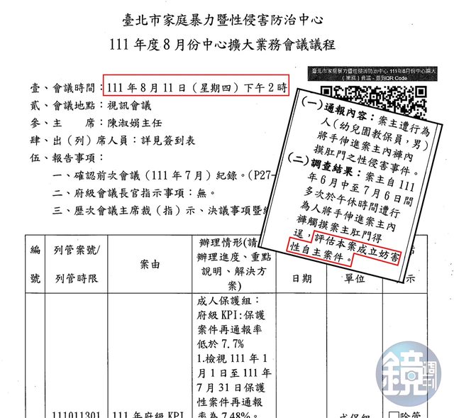: 本刊近日取得北市府2022年8月11日的會議記錄,這場由北市社會局時任家防中心主任陳