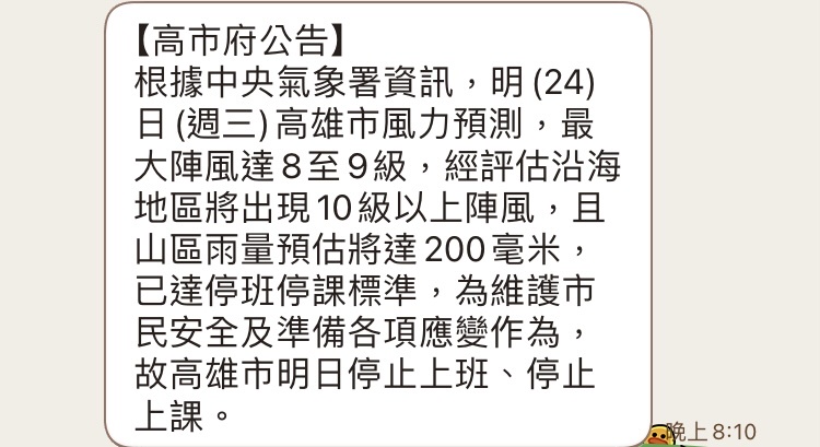 → luckid: 難得放個颱風假 各位體貼一下高雄人好咪 218.166.29.224 07/23 20:45