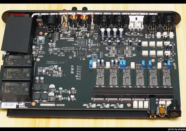 內部一覽,左為電源,中上為數位輸入及控制,右邊為音量控器的繼電器陣列
