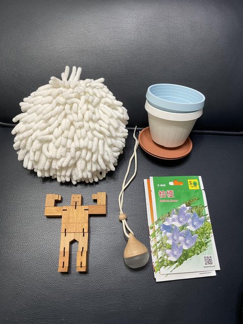 標題[贈送] 盆栽種子、木玩偶、擦手球