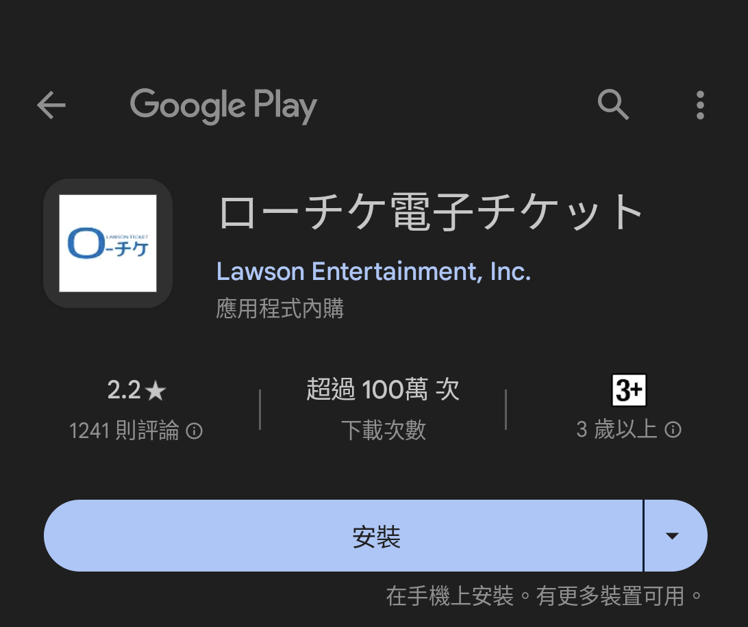不好意思想請問一下,我有申請hana cell (成功拿到080門號),我現在人在日本想要下 載 ローチケ電子チケットapp ,結果從官網的連結連進goolge play後竟然顯示“你的國 家/ 地區不支援這個項目” 不知道有沒有人是用台灣的手機下載成功的? (我用日本飯店的wifi / 在台灣買的日本網卡都無法下載) 感覺不像是網路的問題(所以我也不想冒險用hana cell的網路去試) 如果真不能下載,只能祈禱想看的演唱會不是用l-ticket 電子票券了... -- ※ 發信站: 批踢踢實業坊(ptt-web.org.tw), 來自: 210.155.115.3 (日本) ※ 文章網址: https://ptt-web.org.tw/Japan_Travel/M.1694437178.A.613
