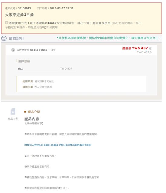 標題[讓售] 9/24大阪樂遊券 Osaka e-pass 一日券