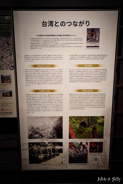 展示室中兩張資料板,說明了石見銀山與台灣的關係,原來位於新北市金瓜石的金礦與銅