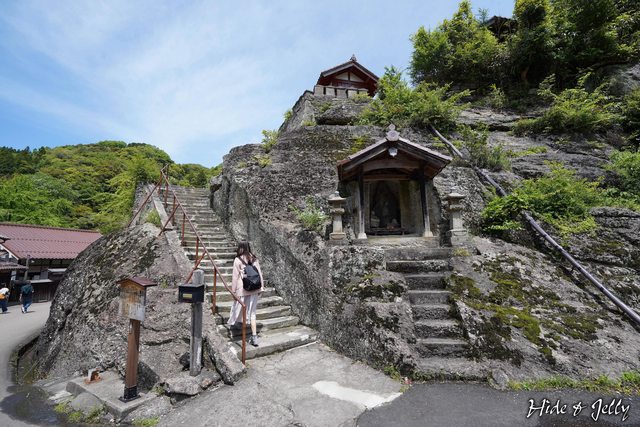交流中心的斜對面,有一處隆起的小丘陵,沿著岩石打造的神龕上,有座觀世音寺,我們