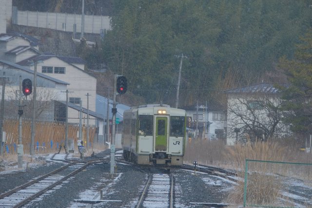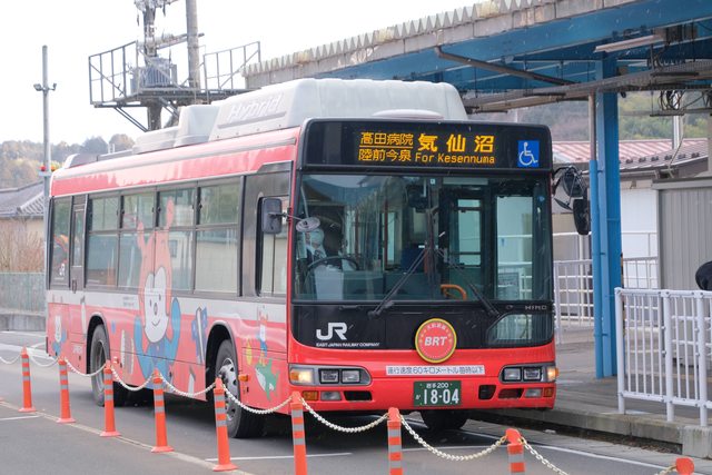 然後抵達了2011年東日本大震災的海嘯的重災區氣仙沼 由於部分海嘯受災鐵軌最後決定用BRT復建,這個站是鐵路旁邊可以轉BRT