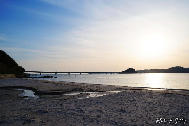 的「島戶海水浴場」,我們走到砂灘上,遠觀著橫跨在本島與角島的角島大橋,斜陽透過