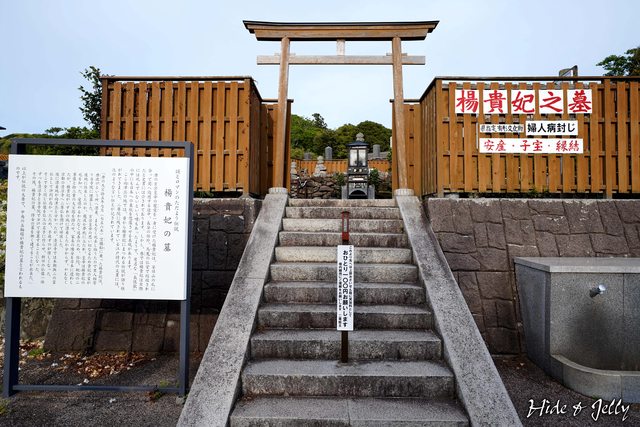 楊貴妃之墓位於一個石座高台上,進入參拜需在階梯前投入1人100円的拜觀料,此地也被