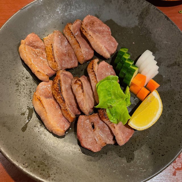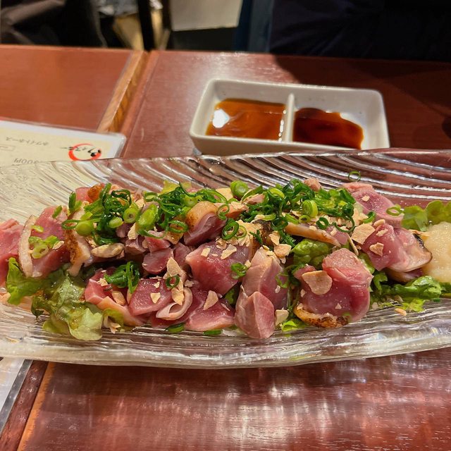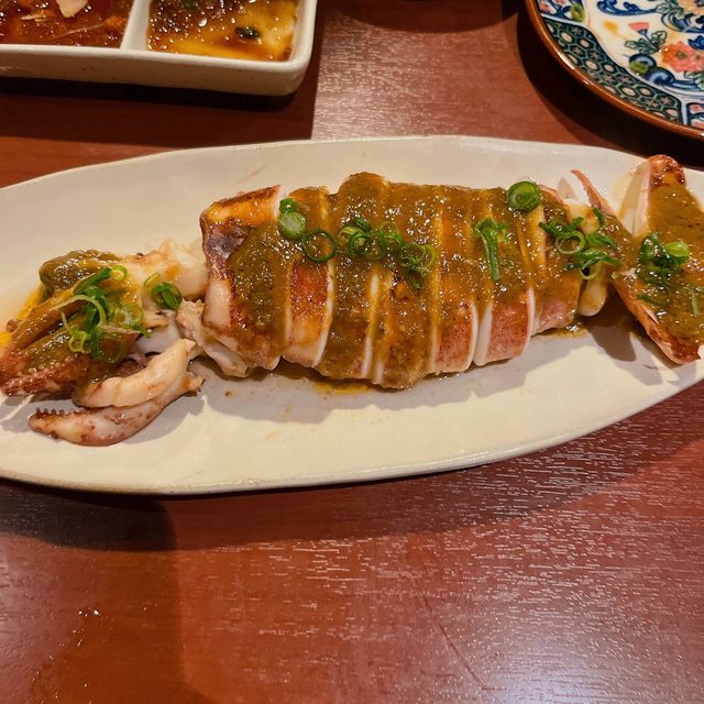 這餐我們吃了蘿蔔餃子、生雞肉沙拉、鹽烤魷魚、老闆以現有食材做的鹽烤鴨肉、燉煮紅