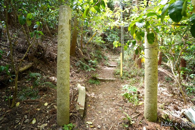 繼續走可以看到一座天明五年(西元1785年)的石鳥居,雖然上方已坍塌,但兩旁石柱仍屹