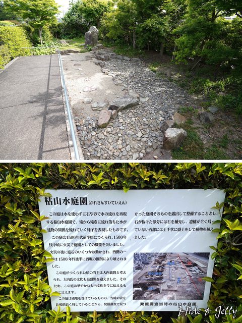 在西北角處有另一個庭園的復元,以石頭與砂再現流水的「枯山水庭園」,調查時還出土