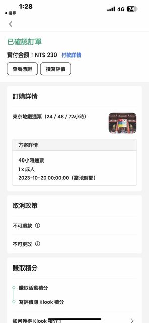 讓售一張KLOOK東京地下鐵48小時兌換券