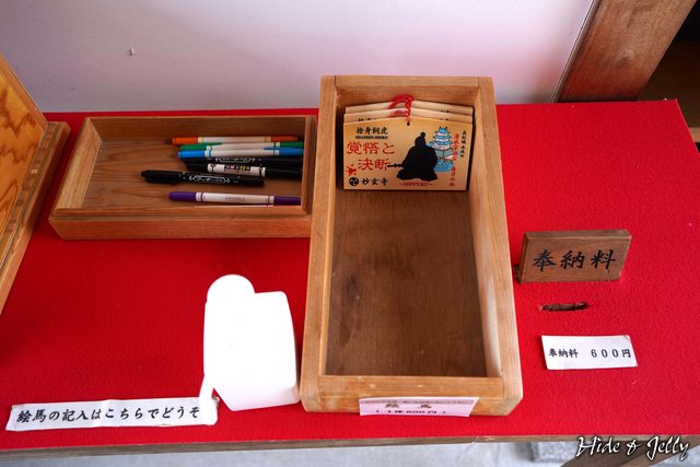 妙玄寺旁擺放著備中高松城最好的紀念品「清水宗治公自刃繪馬」,自助投入600円,帶
