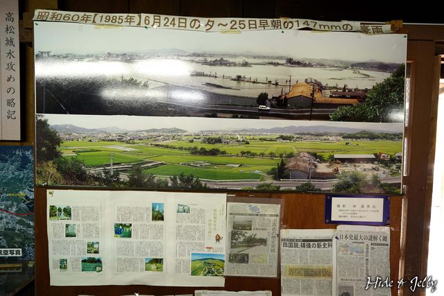 一旁有水淹高度與備中高松城本丸上段高度的落差示意裝置,當年築堤高8.4公尺,本丸