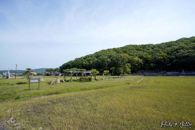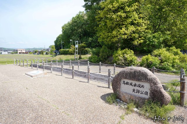 「蛙が鼻築堤跡」就是當年水攻高松城時,黑田官兵衛所築堤之處,現在是一片草原,已