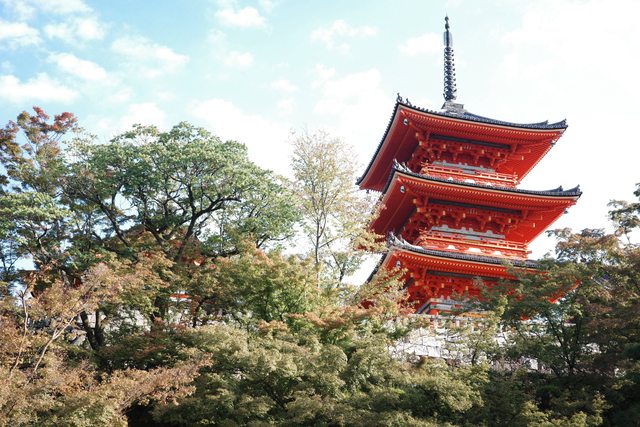 通紅的三重塔少了紅楓的陪襯