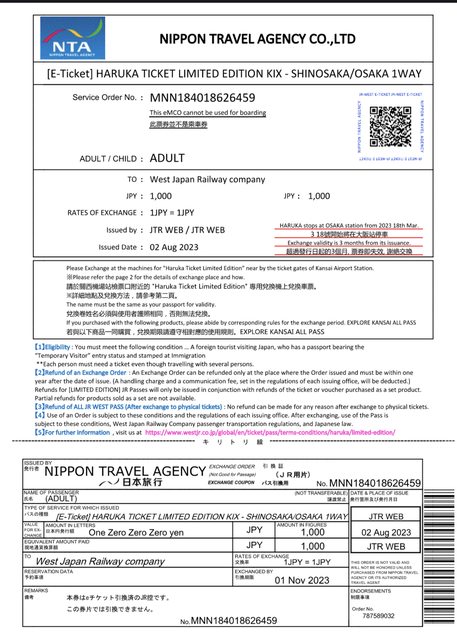 標題[贈送] HARUKA單程票(機場→大阪/新大阪)