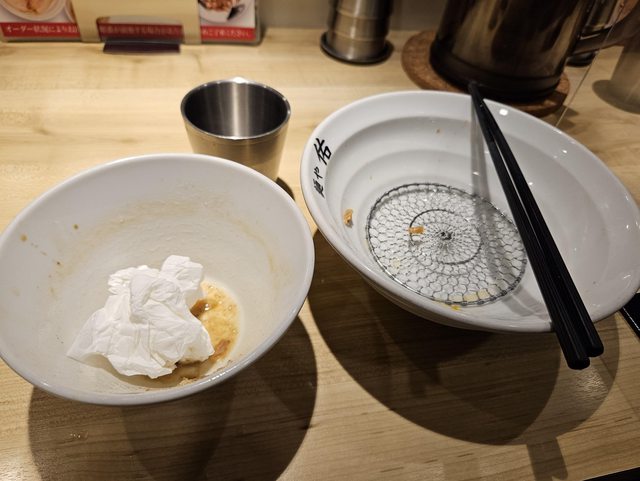 沾麵吃到底下發現了一個鐵網,顯然是避免下面的麵被滲下來的水影響口感用的,跟蕎麥