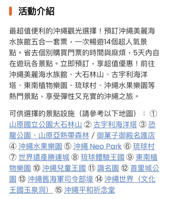 除了美麗海水族館之外,還能再從14個景點挑4個使用,適合自駕遊玩的朋友