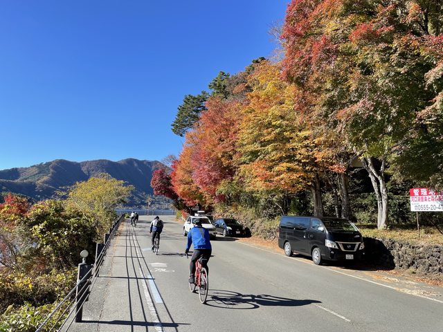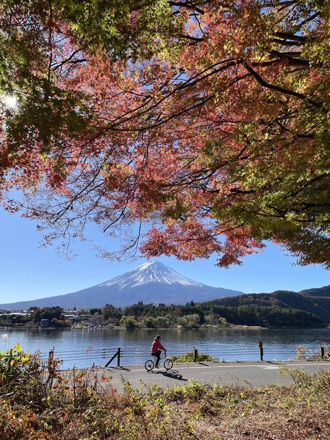 逆時鐘沿著湖畔騎到留守ヶ岩(Momiji Tunnel)再折返 這幾天河口湖見頃 楓況好的不得了 騎腳踏車非常享受 風不大時也不冷 https://i.imgur.com/pa1rTN2.jpg