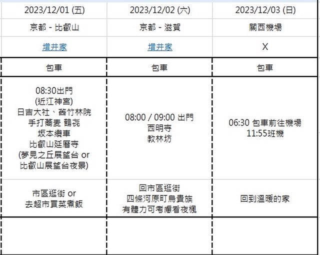 12/1 開始是兩天包車行程,希望可以減輕一點長輩移動的疲勞。比叡山部分括號地點可