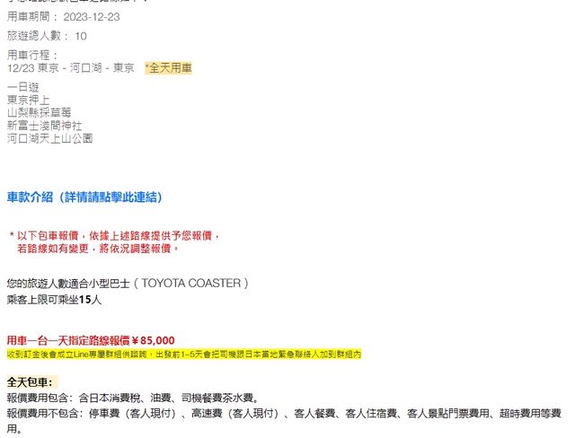 已經請美黛子提供報價,15人座日幣85000(不含過路費等),費用依人頭均分(大人小