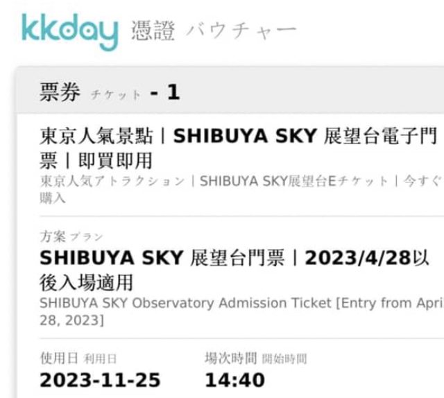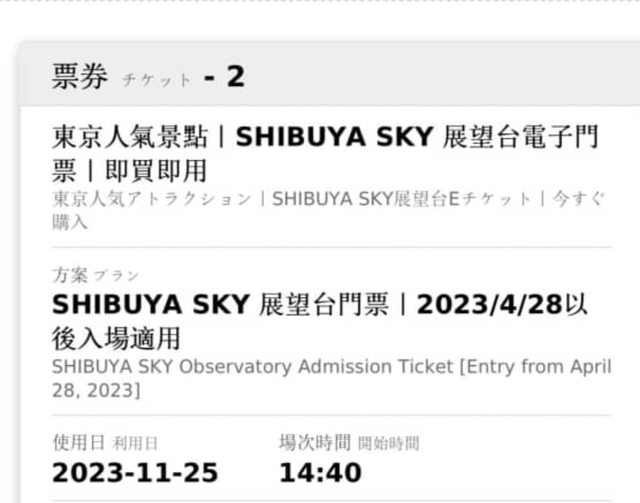 2023/11/25 14:40 東京澀谷天空SHIBUYA SKY全景展望台門票2張