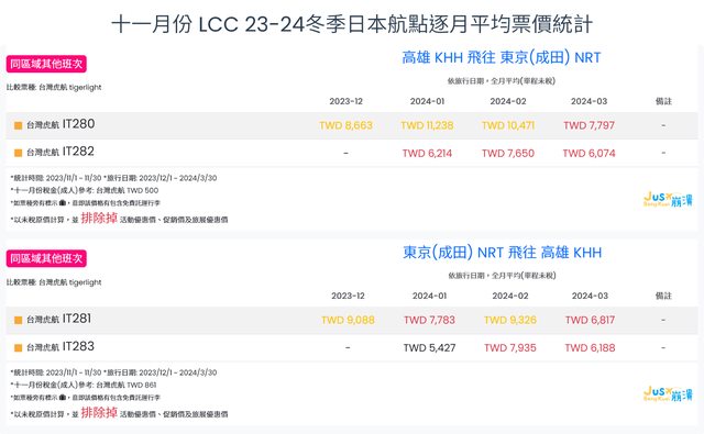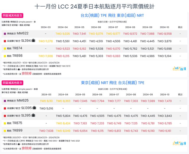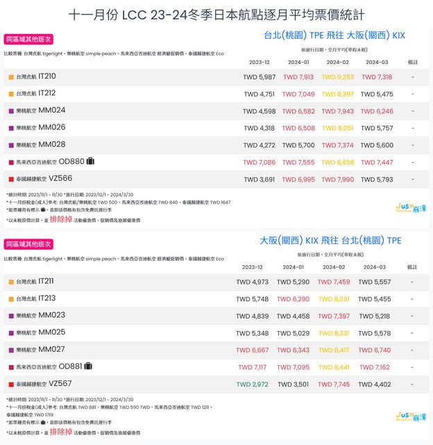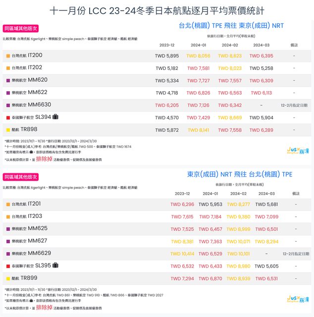標題[分享] 11月LCC 23冬、24夏日本航點逐月均價統計