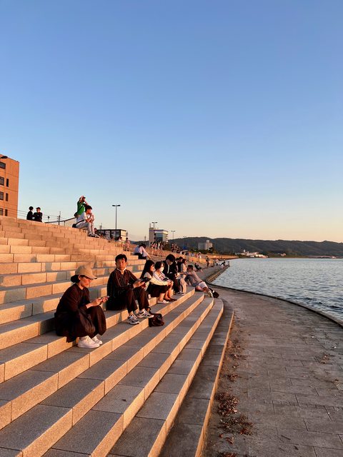 此處湖岸的階梯平台,聚集了許多追夕陽的遊客: