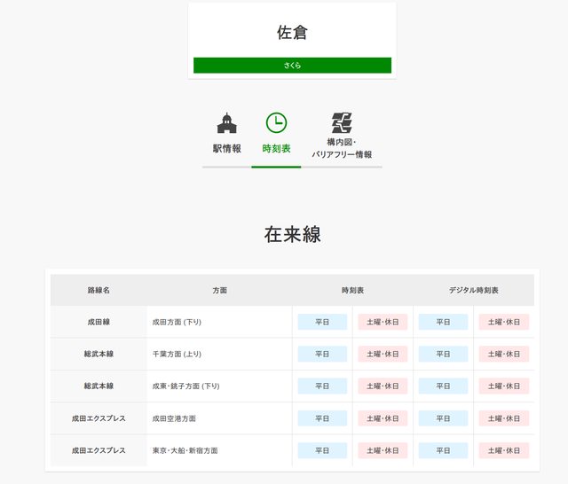 舉例來說,我點開佐倉站的時刻表,選擇右邊的「デジタル時刻表」