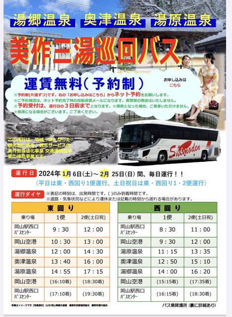 每日有免費巴士可從岡山車站或機場往返美作地區三個溫泉鄉(湯原温泉・奥津温泉・湯郷