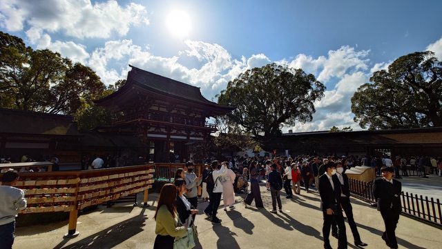 正殿前廣場擠滿了人,適逢接近七五三祭,很多家長帶著小朋友來