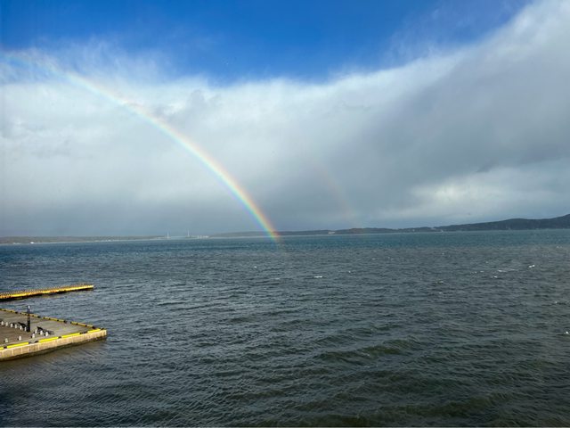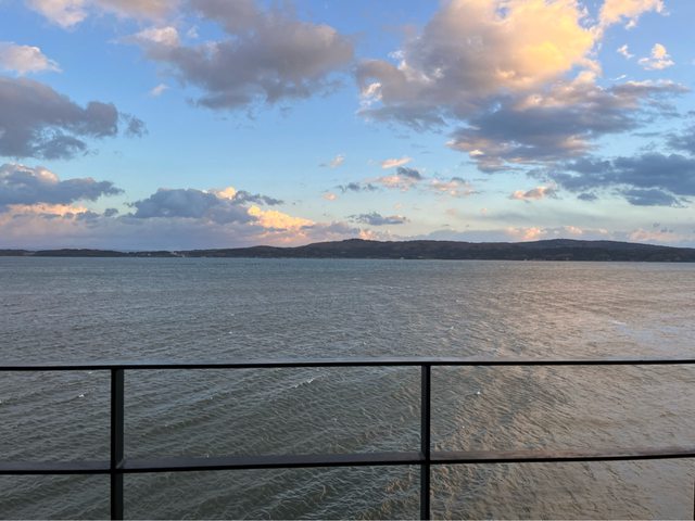 今天一起床,陽光略露臉,在房間的露天風呂泡湯,七尾灣在陽光照耀下更顯美麗。和倉
