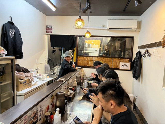 店面不大、約15人的吧檯座位。點餐後先上一杯特製野菜汁,再等約15分鐘,兩碗拉麵(