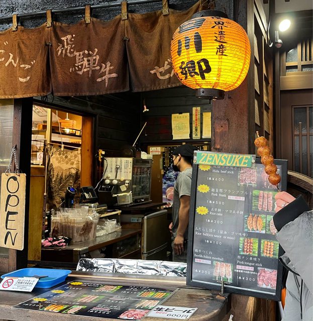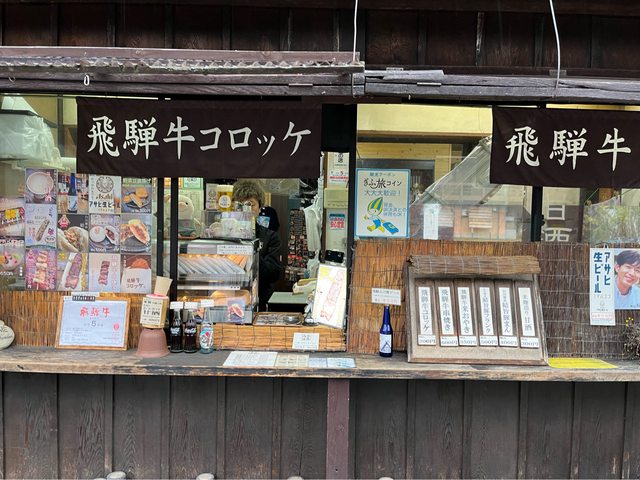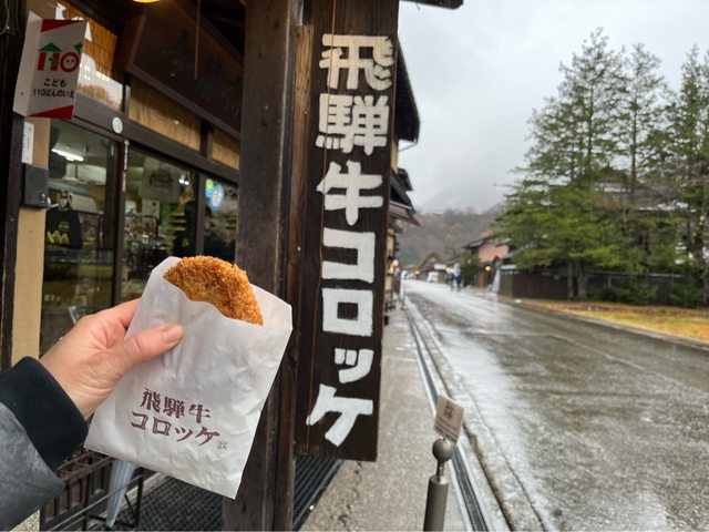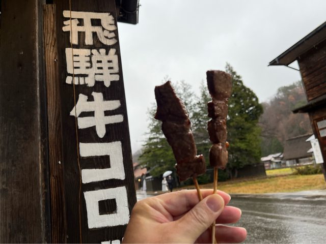 走回去的路上,肚子有點餓,買了飛驒牛肉串(600円/串)及可樂餅(300円/個)當午餐