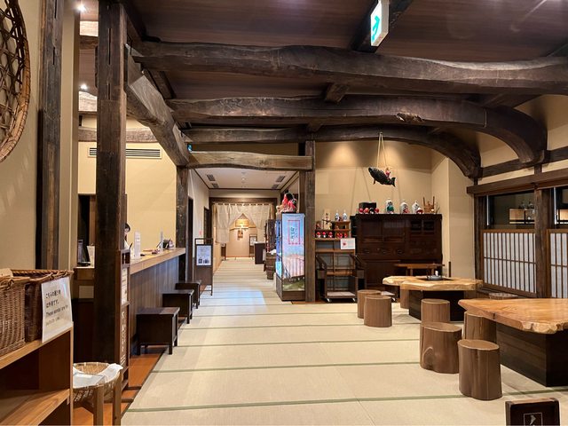 Check in 櫃台在左手邊,前方的樓梯可上2樓,有陳列桌椅、一些旅遊資訊、男女浴衣(