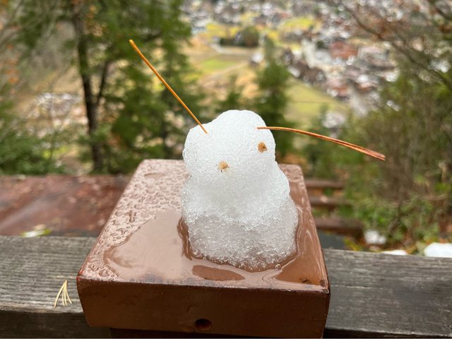 晚或今早有飄點雪,早到旅客堆成的小雪人已漸溶化。