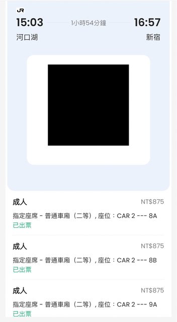 1. 讓售品項:12/19 富士迴游 河口湖->新宿 36班次 發車時間15:03